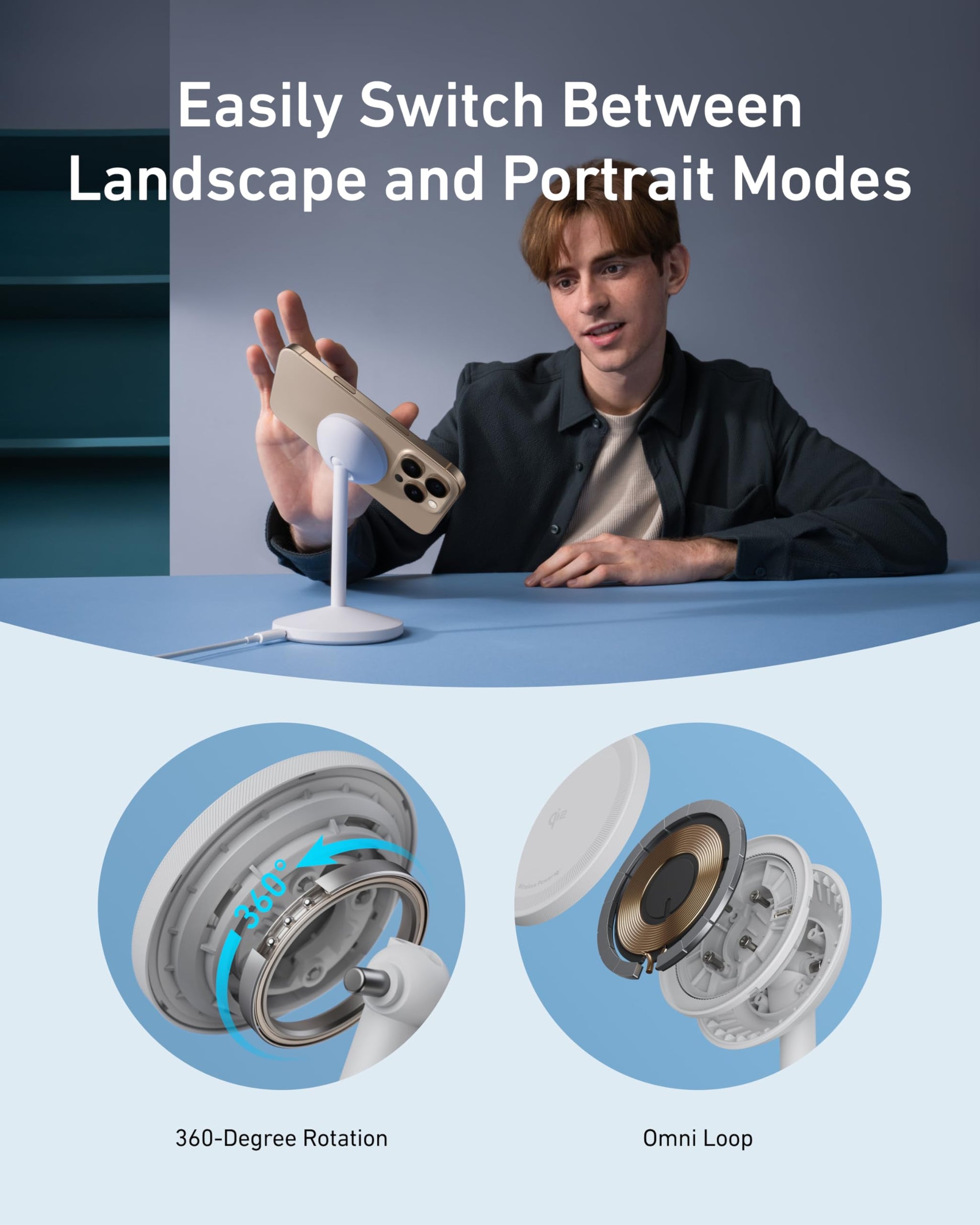 360° Rotation with Adjustable Charging Surface: The wireless charger features a patented 360° rotating mechanism for seamless orientation changes and an adjustable tilt for the perfect viewing angle.